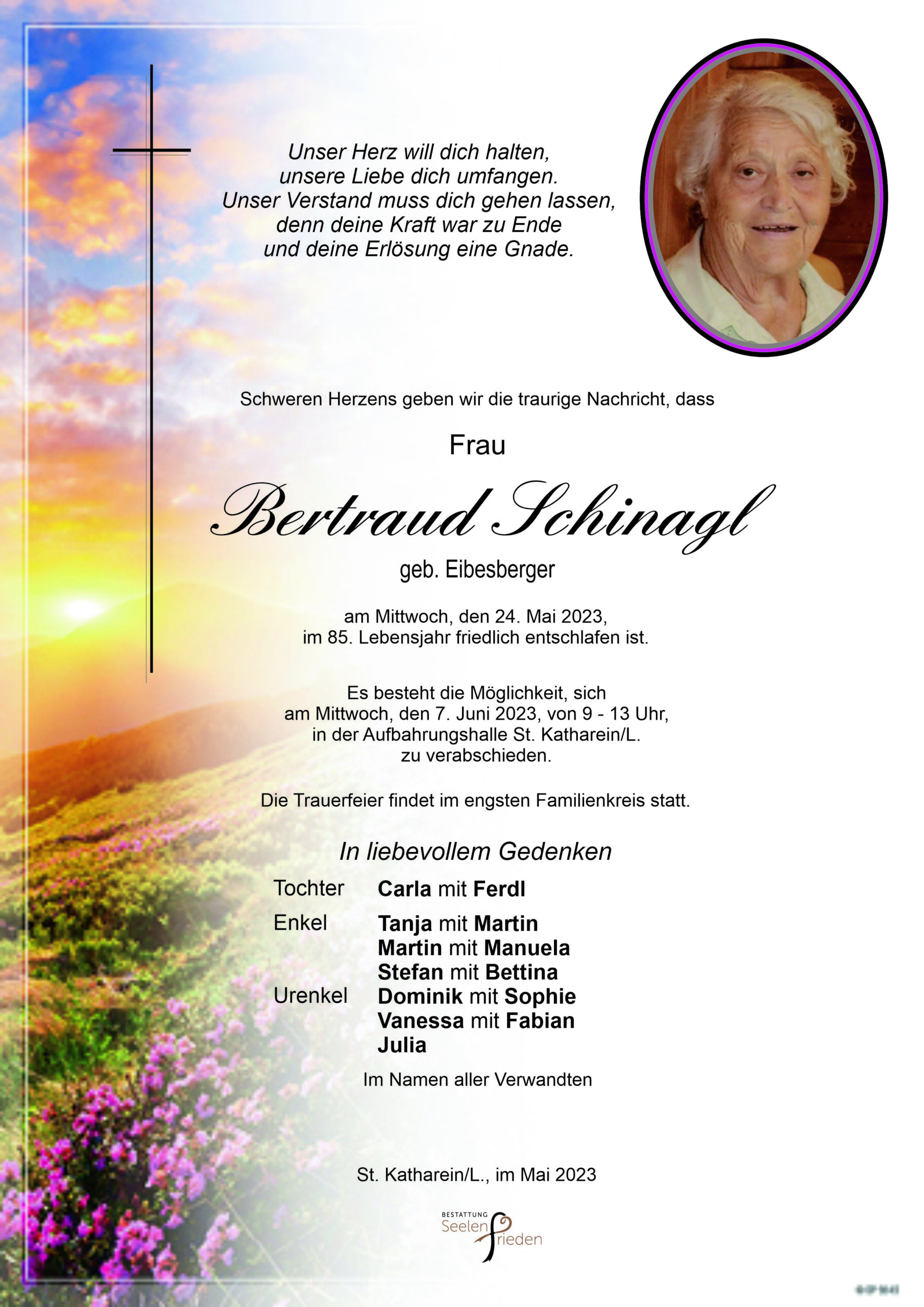 Bertraud Schinagl war eine außergewöhnliche und bewundernswerte Person, deren Andenken für immer in Ihren Herzen verbleiben wird.